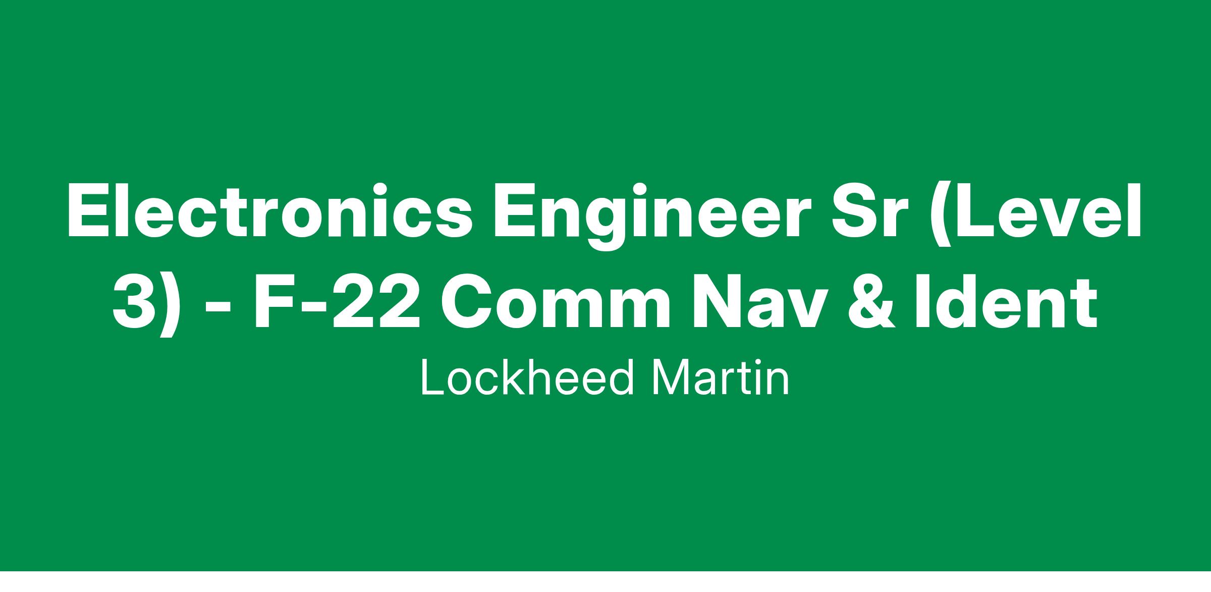 The Electronics Engineer Sr will be assigned to the F-22 Integrated Fighter Group CNI Hardware Team supporting the sustainment of Communication, Navigation and Identification products on F-22 aircraft. The candidate will support the troubleshooting, root cause and corrective action, and capability development for the Communication Navigation and Identification products. Candidate will be a liaison between the Air Vehicle Systems team and its customers to ensure conformance to cost, schedule, quality and technical requirements. Individual will be support development of solutions to technical problems of varying complexity, perform in a team environment and work under the direction of a group lead. Candidate will support subcontract planning, system integration, verification and validation, and cost and risk management.