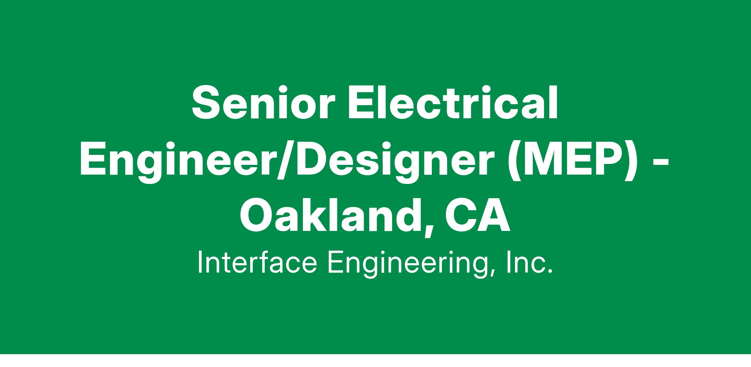 Interface Engineering Inc., an internationally recognized leader in high performance design, is seeking to add an Associate / Senior Electrical Engineer/Designer (MEP) to our Oakland, CA based MEP team. Our team members have the freedom to define their own career path and evolve their role to play to their strengths. You will have the opportunity to quickly tackle new challenges and responsibilities, make an impact, and grow your role organically. Interface encourages everyone to come with questions and bring new ideas and solutions - we foster a culture of learning and growing. Our uniquely designed “Path to Leadership” offers clear cut means to advancement, measured in specific metrics and attributes - but our employees are supported in making their career path their own. We are successful collectively when our team members are empowered individually.
